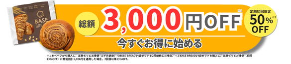 2回の継続で総額3,000円分の割引が受けられるため、ベースブレッドをお得に始めたい方は、以下の特別クーポンをぜひチェックしてみてください。