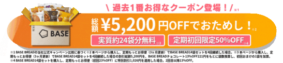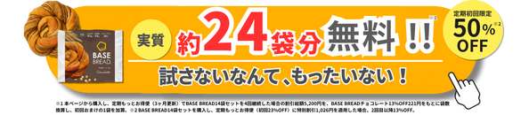 ※1 本ページから購入し、定期もっとお得便(3ヶ月更新)でBASE BREAD14袋セットを4回継続した場合の割引総額5,200円を、BASE BREADチョコレート13%OFF221円をもとに袋数換算し、初回おまけの1袋を加算。※2 BASE BREADの当社公式キャンペーン比較に基づく ※3 本ページから購入し、定期もっとお得便(3ヶ月更新)でBASE BREAD14袋セットを4回継続した場合。
