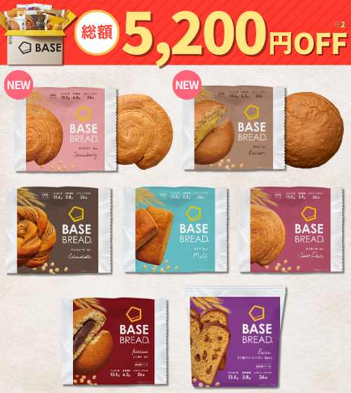 ※1 本ページから購入し、定期もっとお得便(3ヶ月更新)でBASE BREAD14袋セットを4回継続した場合の割引総額5,200円を、BASE BREADチョコレート13%OFF221円をもとに袋数換算し、初回おまけの1袋を加算。※2 BASE BREADの当社公式キャンペーン比較に基づく ※3 本ページから購入し、定期もっとお得便(3ヶ月更新)でBASE BREAD14袋セットを4回継続した場合。