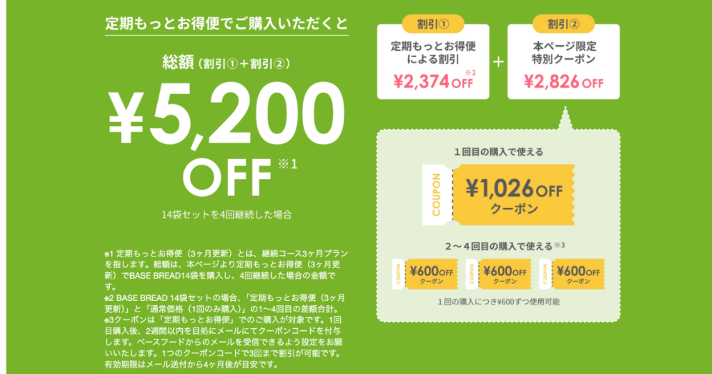 ※1 BASE BREADの当社公式キャンペーン比較に基づく ※2 定期もっとお得便(3ヶ月更新)とは、継続コース3ヶ月プランを指します。総額は、本ページより定期もっとお得便(3ヶ月更新)でBASE BREAD14袋を購入し、4回継続した場合の金額です。※3 BASE BREAD 14袋セットの場合、「定期もっとお得便(3ヶ月更新)」と「通常価格(1回のみ購入)」の1〜4回目の差額合計。※4クーポンは「定期もっとお得便」でのご購入が対象です。1回目購入後、2週間以内を目処にメールにてクーポンコードを付与します。ベースフードからのメールを受信できるよう設定をお願いいたします。1つのクーポンコードで3回まで割引が可能です。有効期限はメール送付から4ヶ月後が目安です。