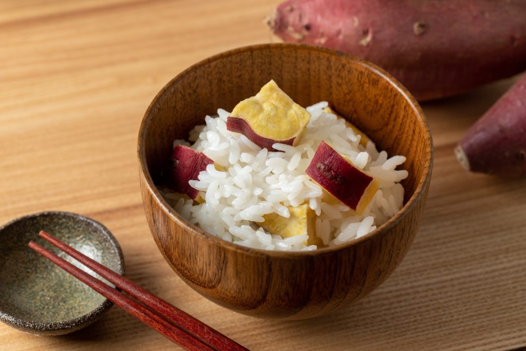 栄養素を効率よく摂取するためにも、さつまいもは皮ごと使用しましょう。白米に黄色と紫が映え、見た目も華やかになります。好みできのこを加えてもよいでしょう。