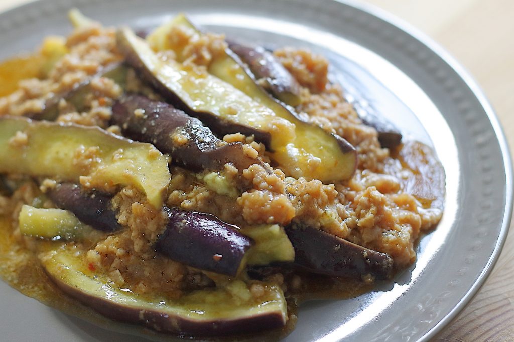 - 合わせ調味料を回しかけて上から一味をふる