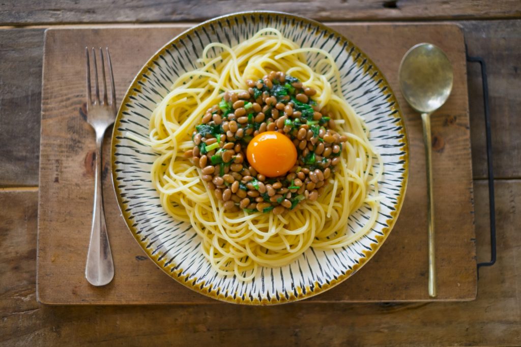- 器にパスタを盛り、納豆をかけて中央をにくぼみを作る