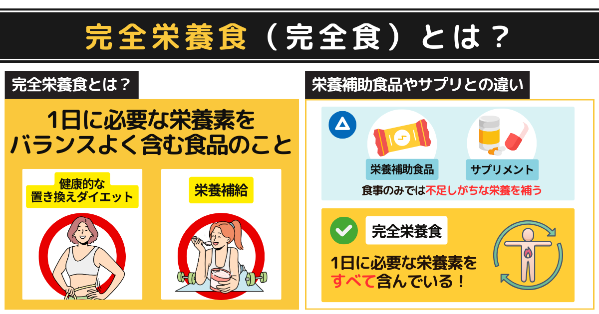 完全栄養食と栄養補助食品、名前は似ていますが、両者は異なる商品です。違いやそれぞれの特徴は、次のとおりです。