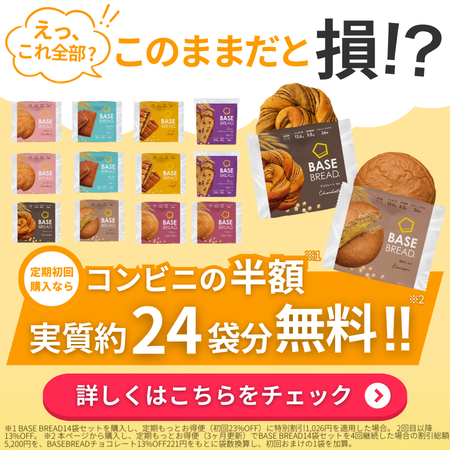 ※1 BASE BREADの当社公式キャンペーン比較に基づく ※2 本ページから購入し、定期もっとお得便(3ヶ月更新)でBASE BREAD14袋セットを4回継続した場合の割引総額5,200円を、BASE BREADチョコレート13%OFF221円をもとに袋数換算し、初回おまけの1袋を加算。※3 本ページから購入し、定期もっとお得便(3ヶ月更新)でBASE BREAD14袋セットを4回継続した場合。