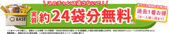 ※1 本ページから購入し、定期もっとお得便(3ヶ月更新)でBASE BREAD14袋セットを4回継続した場合の割引総額5,200円を、BASE BREADチョコレート13%OFF221円をもとに袋数換算し、初回おまけの1袋を加算。※2 BASE BREADの当社公式キャンペーン比較に基づく ※3 本ページから購入し、定期もっとお得便(3ヶ月更新)でBASE BREAD14袋セットを4回継続した場合。