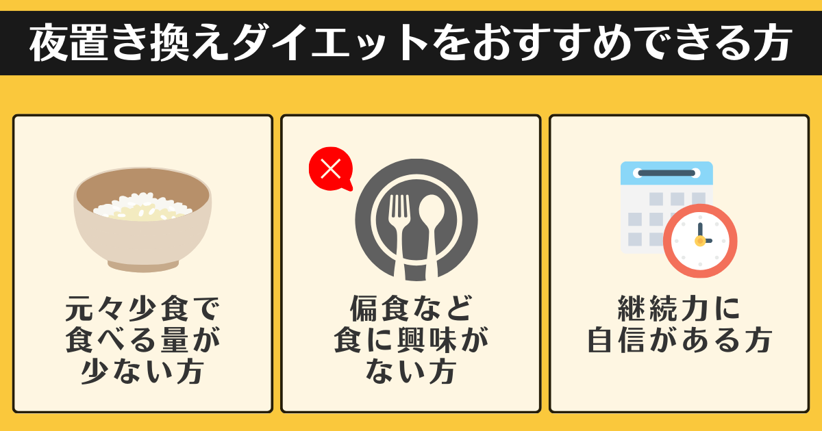 夜置き換えダイエットは、一般的な成人の方に向いていますが、上記の方はとくに向いています。
