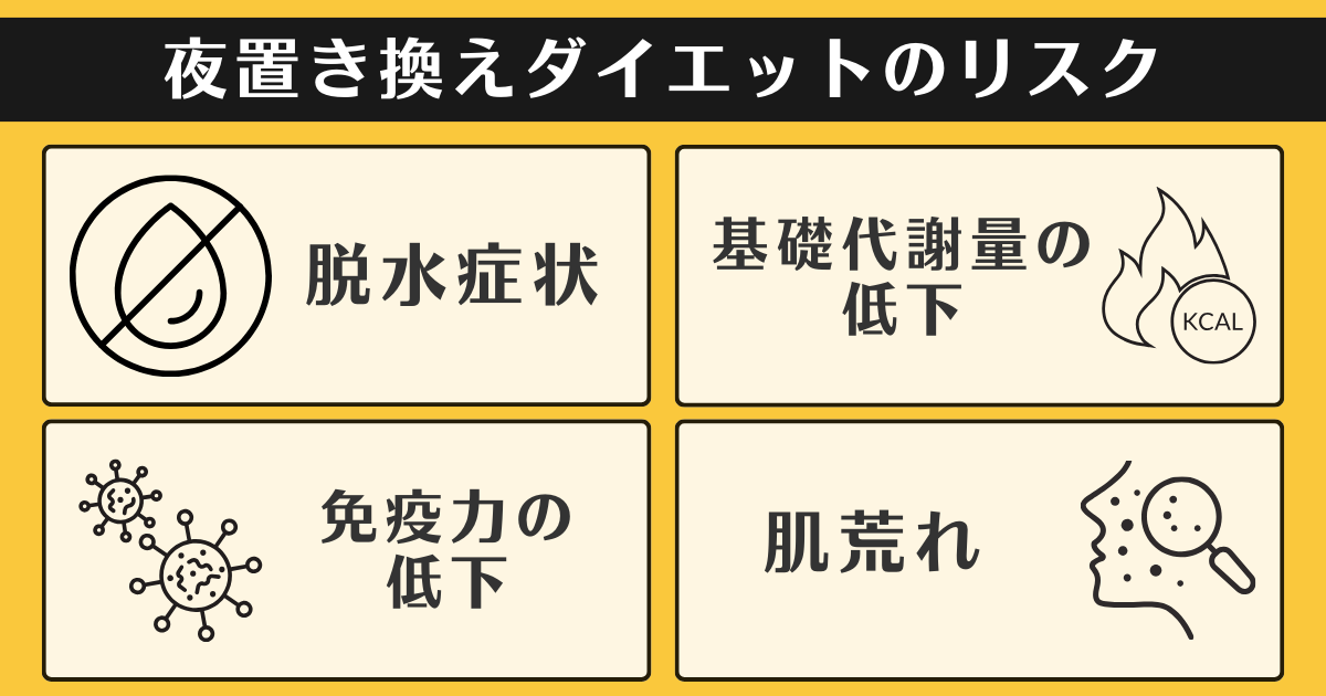 過度な置き換えダイエットは、免疫力の低下や、基礎代謝の低下につながる恐れがあります。免疫力低下から、体調不良になると、健康的にダイエットを継続できなくなります。
