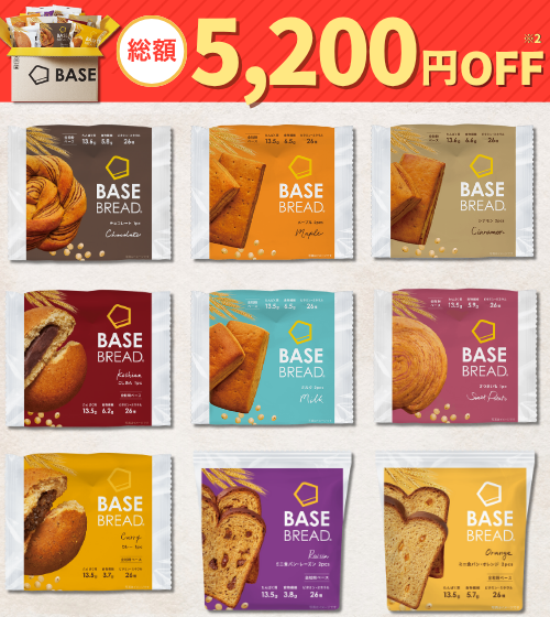 ※1 本ページから購入し、定期もっとお得便(3ヶ月更新)でBASE BREAD14袋セットを4回継続した場合の割引総額5,200円を、BASE BREADチョコレート13%OFF221円をもとに袋数換算し、初回おまけの1袋を加算。※2 BASE BREADの当社公式キャンペーン比較に基づく ※3 本ページから購入し、定期もっとお得便(3ヶ月更新)でBASE BREAD14袋セットを4回継続した場合。