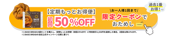 ※1 BASE BREADの当社公式キャンペーン比較に基づく ※2 本ページから購入し、定期もっとお得便(3ヶ月更新)でBASE BREAD14袋セットを4回継続した場合。