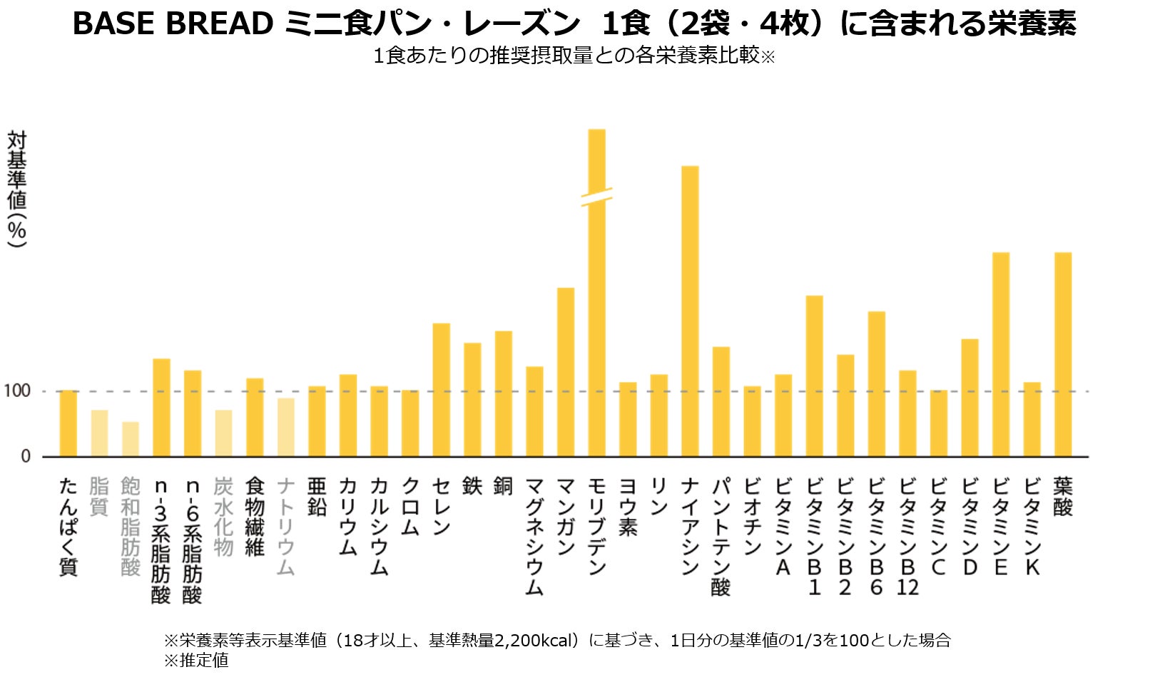 1食に必要な33種類の栄養素がすべてとれる完全栄養パン*1「BASE BREAD ミニ食パン・レーズン」を、2023年5月22日(月)より、公式オンラインショップ、他ECサイト、取扱販売店にて順次新発売します。