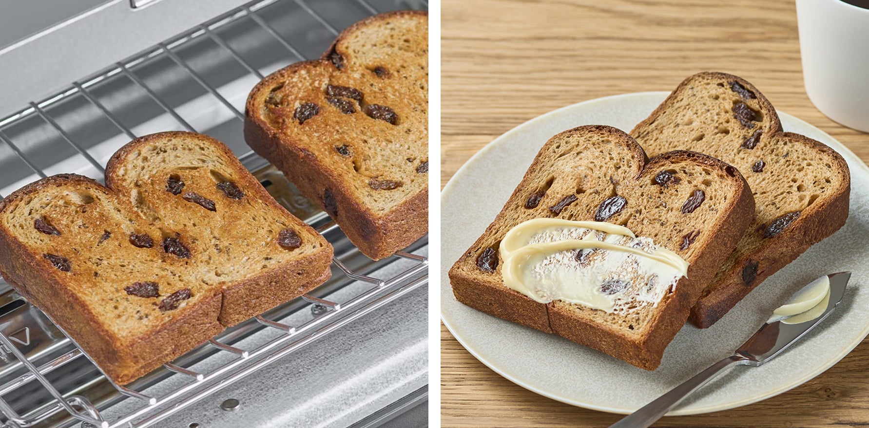 レーズンをそのまま食べたときのような固い食感ではなく、果実のようなじゅわっとみずみずしい食感と甘みが特徴で、レーズン本来の甘さと全粒粉生地の風味がマッチし、甘すぎず、毎日食べても飽きのこない商品になっています。また、レーズンをたっぷりと使用すると共に、パン生地の原材料や配合を調整しているため、そのままで食べても、トーストしても、レーズンの豊かな香りと風味をお楽しみいただけます。さらに、パン生地自体にも改良を加え、ふんわりとしていてしっとりとした食感に仕上げています。