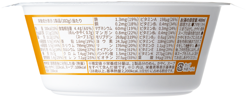 *1 1食分(2個/1個あたり調理後スープ約110gを含む)で、栄養素等表示基準値に基づき、脂質・飽和脂肪酸・炭水化物・ナトリウム以外のすべての栄養素で1日分の基準値の1/3以上を含む。