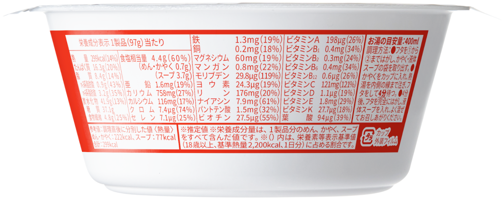 気になるカロリーも「鶏ガラ醤油」は299kcal、「味噌」は330kcal(共に1個あたり)。さらに、塩分量もそれぞれ約30%/約35%オフ※7と一般的な他の即席カップ麺と比較しても抑えられた設計になっています。
