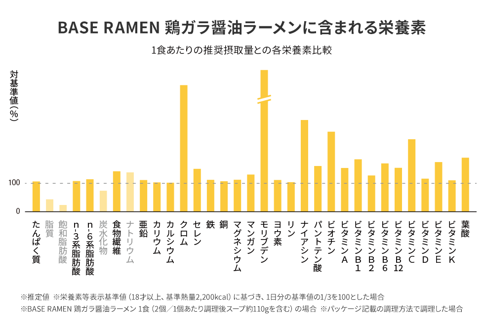 「BASE RAMEN」は、全粒粉をベースに主に植物由来の原材料を使用し、1食(2個)でたんぱく質、食物繊維、ビタミン・ミネラルなど、からだに必要な33種類の栄養素を摂ることができ、「鶏ガラ醤油」には、たんぱく質16.3g、食物繊維4.8g、鉄1.3mg、カルシウム116mg、「味噌」には、たんぱく質17.1g、食物繊維5.4g、鉄1.3mg、カルシウム116mg※5が含まれています。